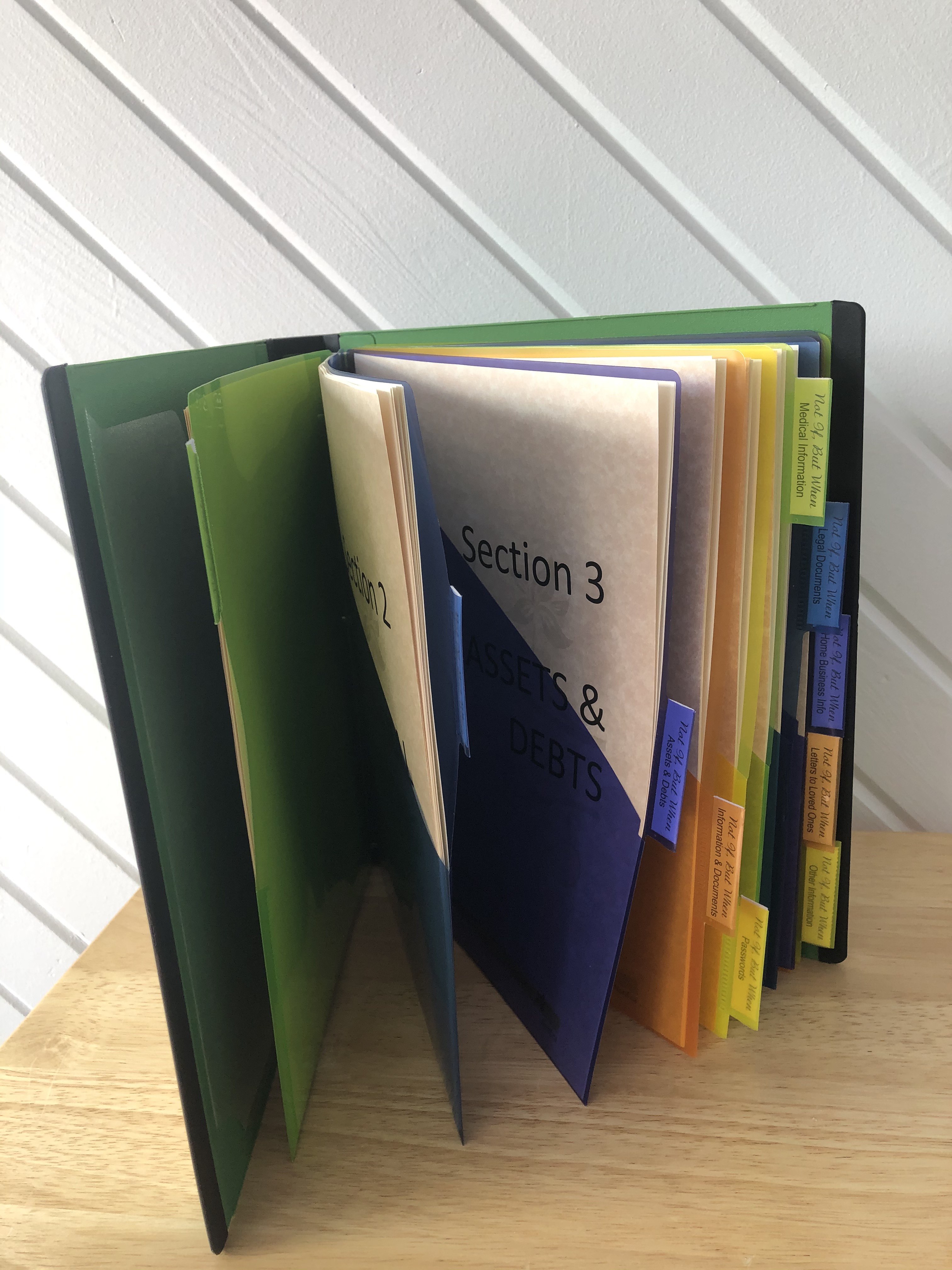 It is also laid out so that you can make changes and add to it as the years go by. You can also add sections to it if needed – there is no way this can encompass all. You may have a special needs person in your family who will require special care – that you may or may not have set up in writing; you may have a partnership with a friend or family member in business that choices will have to be made whether to carry on or to dissolve – which may or may not be in writing; you may know who you wish to raise your children when you are gone – which may or may not be in writing; you may be the owner of a family business and know who you want to take over – which may or may not be in writing. These are just some of the scenarios off the top of my head – there will be literally thousands more.